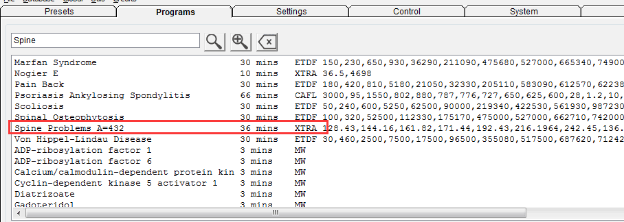 Open Spooky2 software and go to Presets tab. Under Shell (Empty) Presets\Scalar, click Spooky Scalar General (SS)–JW, then go to Programs tab and search “spine”.