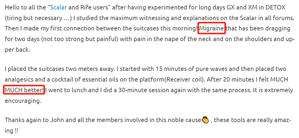 If you want faster and more powerful migraine relief, you can try molecular scalar and Rife scalar. To use the molecular scalar, put the analgesics or essential oils of your choice after setting the Spooky2 Scalar up. The scalar wave will carry the property of the chemicals into your cells and work at a molecular level as if your body has taken in the chemicals.