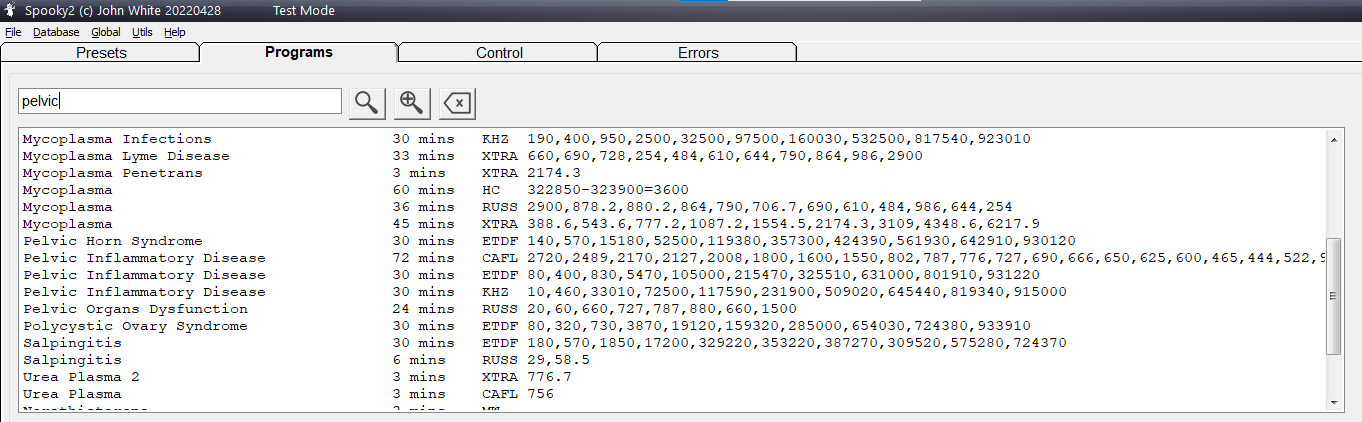 Step 3: Open Spooky2 software. Go to the Presets tab and click Shell (Empty) Presets > Scalar > Spooky Scalar General (SS) – JW. Then go to the Programs tab and search “pelvic”, and you will see a series of programs. Double click on the programs you need.