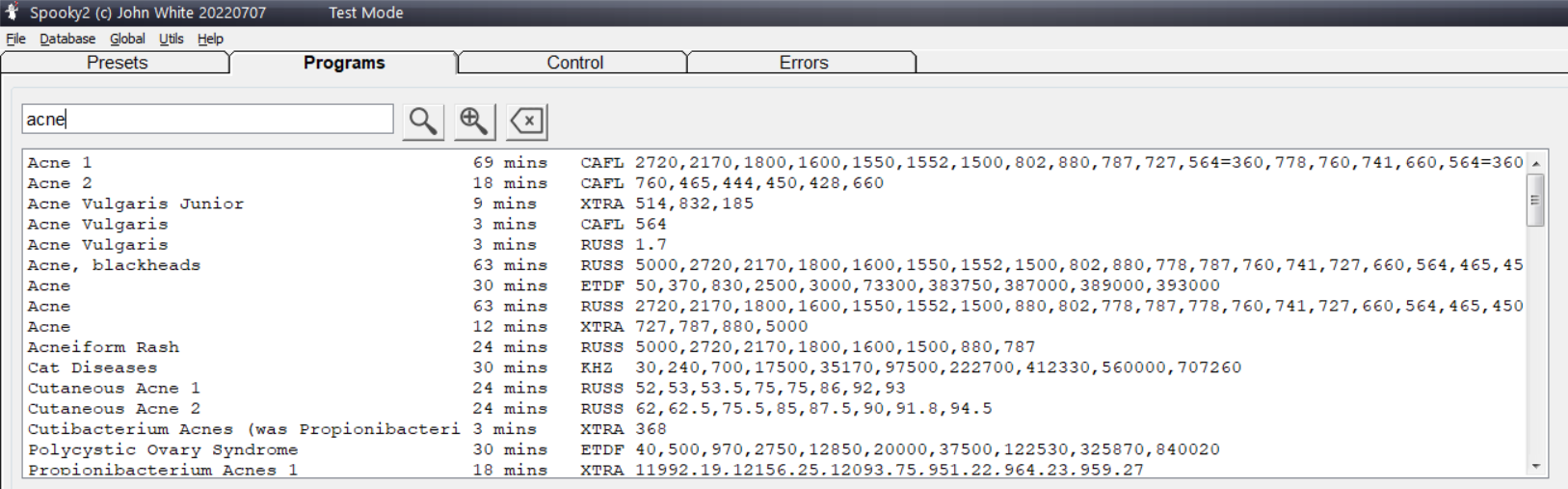 Step 3: Open Spooky2 software. Go to the Presets tab and click Shell (Empty) Presets > Scalar > Spooky Scalar General (SS) – JW. Then go to the Programs tab and search “acne”, and you will see a series of programs. Double-click on the programs you need.