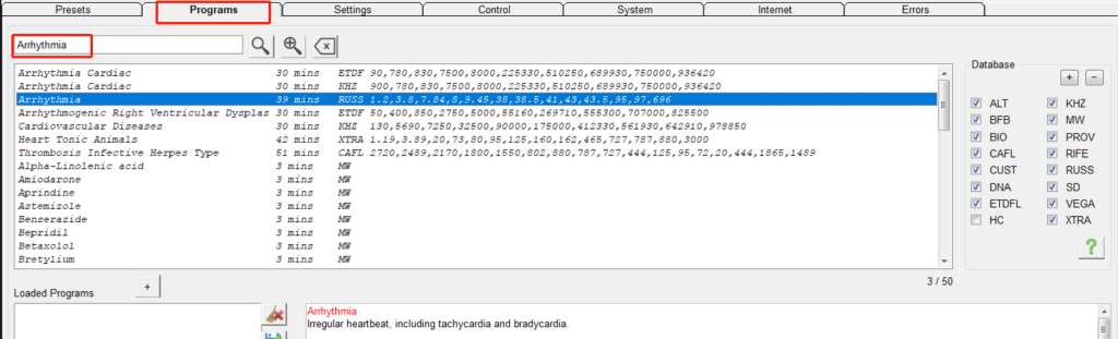 Go to the Programs tab and type your specific heart condition, such as “Arrhythmia,” into the search box to find related programs. This free software includes over 60,000 programs suitable for various conditions, including heart disease, with many designed specifically for heart function and balance.