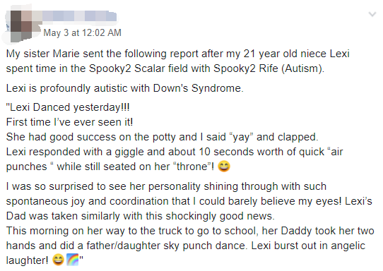 One of our users shared with us in the group said that his niece Lexi with autism gets good results using Spooky2 Scalar. He said: “I was so surprised to see her personality shining through with such spontaneous joy and coordination that I could barely believe my eyes! Lexi’s Dad was taken similarly with this shockingly good news.”