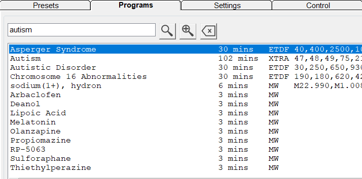 Open Spooky2 software and go to the Presets tab. Under Shell (Empty) Presets\Scalar, click Spooky Scalar General (SS) – JW, then go to programs tab and search “autism”. The following are the programs that you can run using Spooky2 Scalar.
