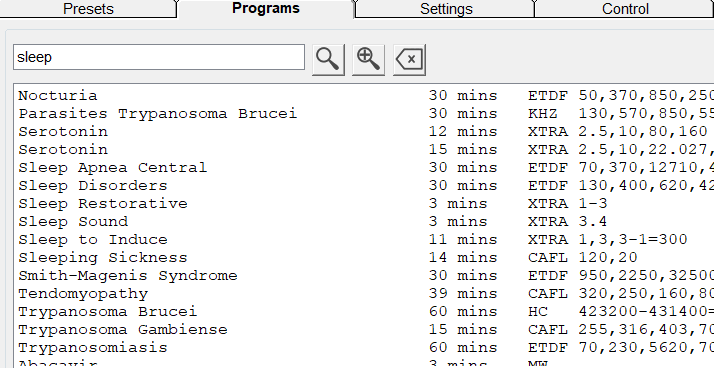 Check the Spooky2 Software, under Shell(Empty) Presets\Scalar, Click Spooky Scalar General (SS) –JW, go to programs tab and search “sleep”. The following are the frequencies that you can run using Spooky2 Scalar.