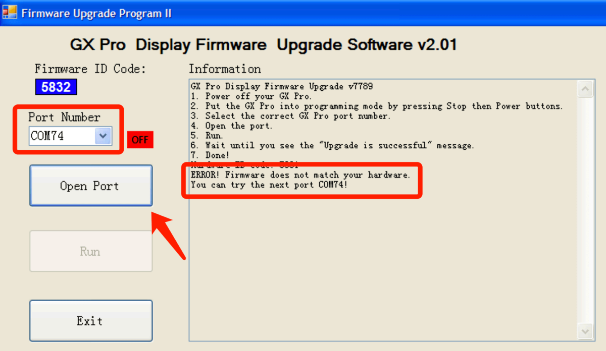 5. Press the Open Port button. Each GX has two ports. Only one port can be used to upgrade the firmware. If you select the wrong port, the next available port will be automatically selected. In this example, port 73 was not available, and port 74 is now automatically selected.
