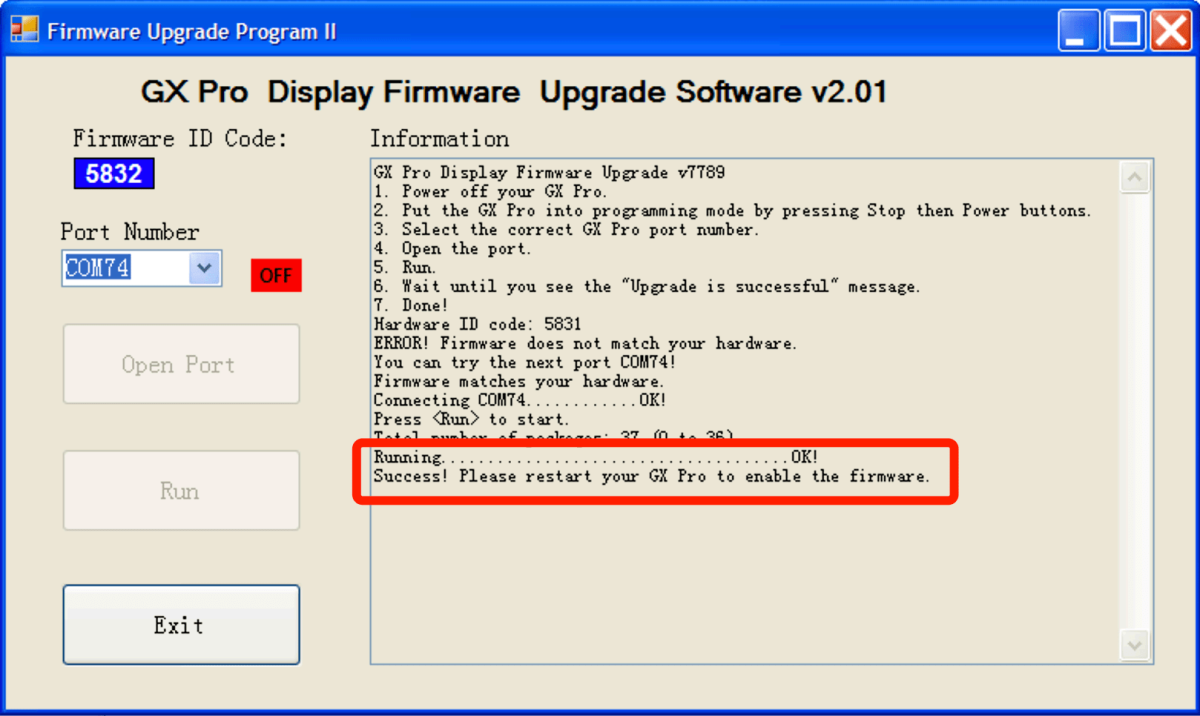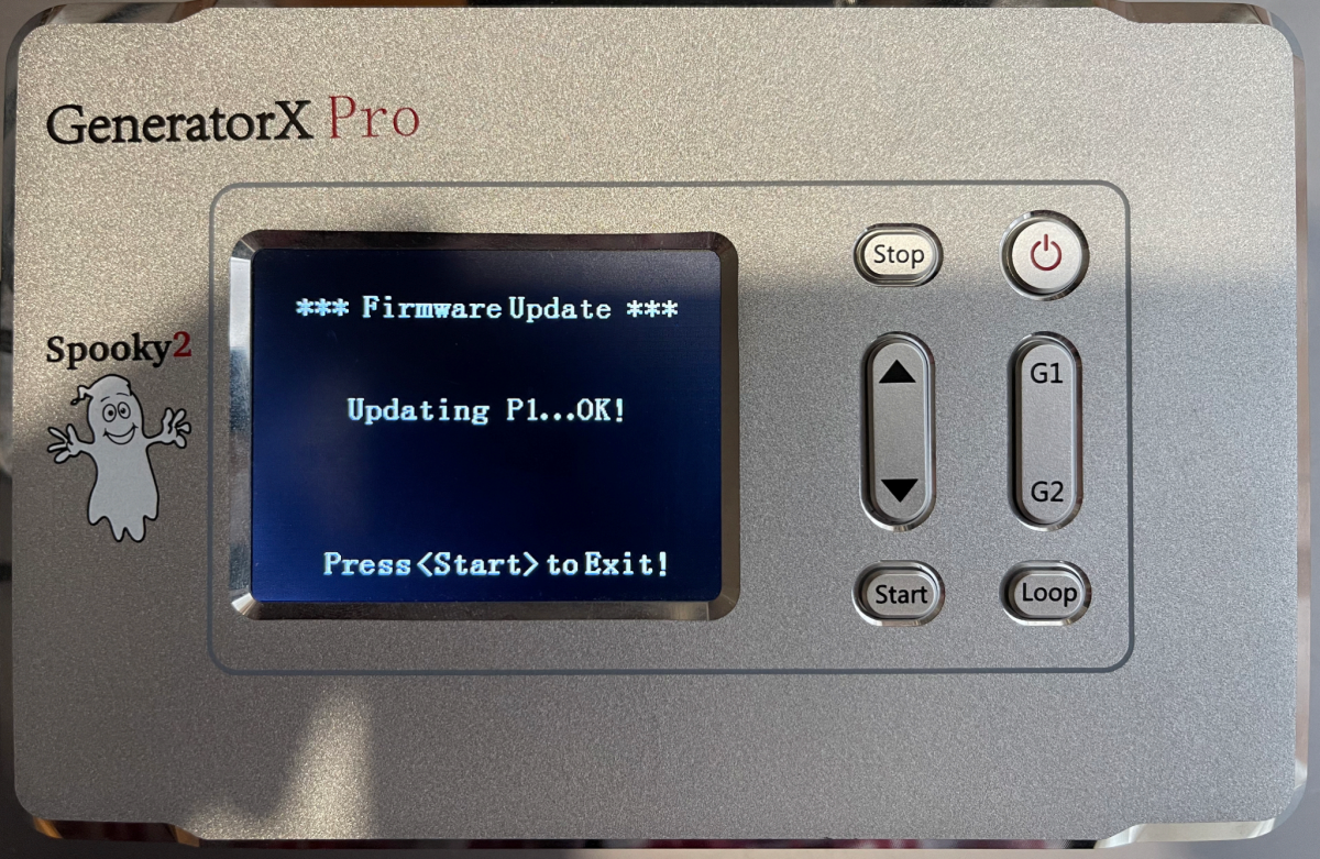The GX Pro display will show “OK!”. You can now press the Start button to exit. It is best to restart the generator after updating the firmware.