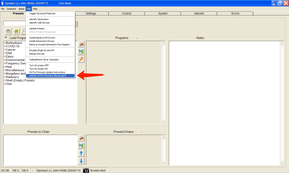 3. If you have Spooky2 software version 20240115 or later, select “Utils / Update GX Pro Firmware” from the top menu. All generators will be halted, and the Spooky2 software will immediately quit.