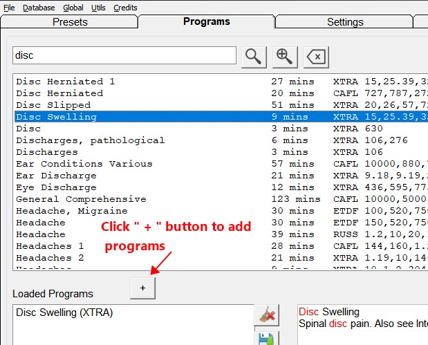 Move to the Programs tab, type “back pain” into the Search field, and double-click the programs you need.