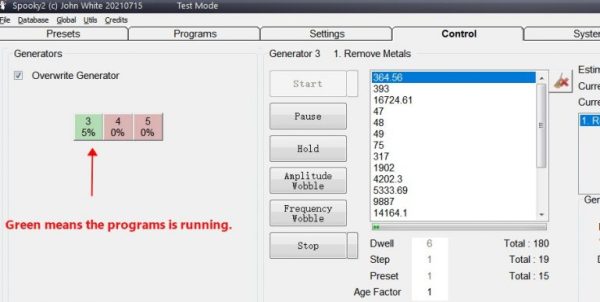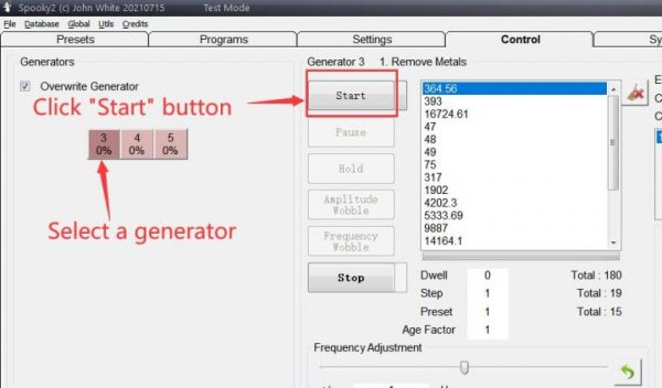 Go to Control Tab, tick Allow Generator Overwrites, open a generator button. After the frequencies are loaded, you can click Start button to start the treatment. Then, you will see both of the LEDs on Spooky2 Remote light up.